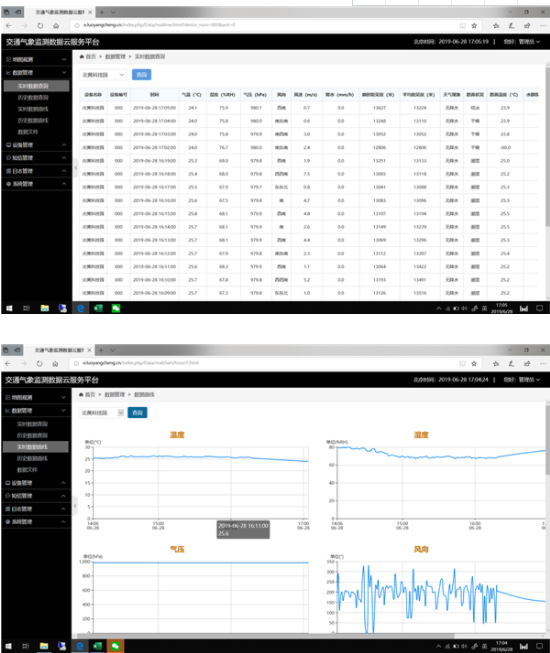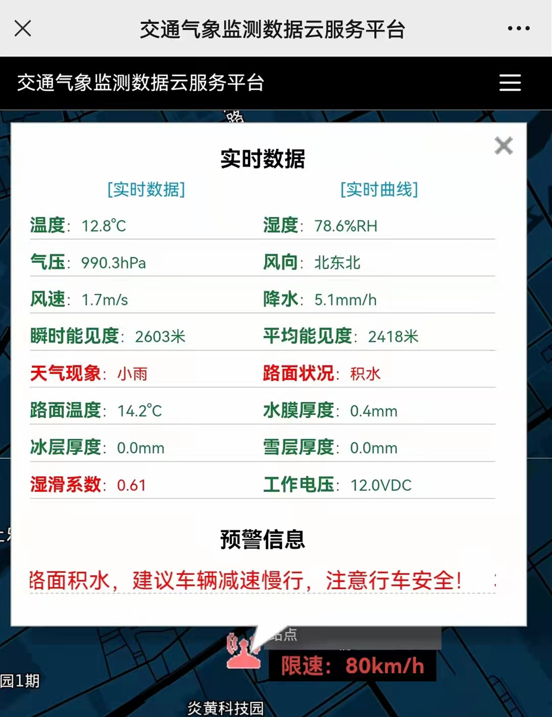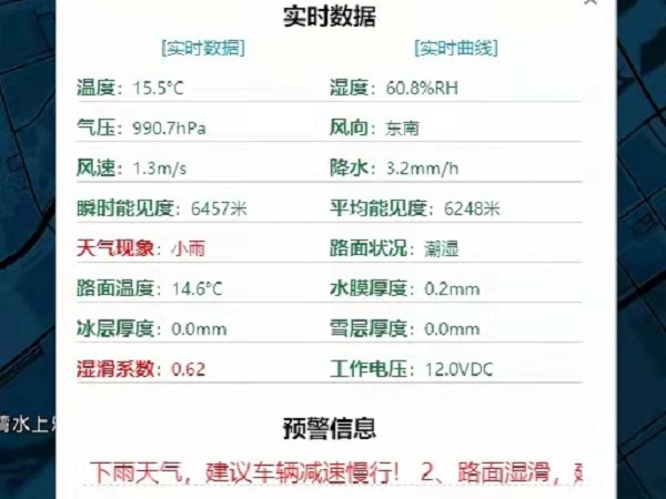 在監測平臺中,實時數據主要展現數據有:溫度、氣壓、風速、瞬時能見度、天氣現象、路面溫度、冰層厚度、濕滑系數、濕度、風向、降水、平均能見度、路面狀況、水膜厚度、雪層厚度、工作電壓等,不同的氣象要素可根據需求進行定制。